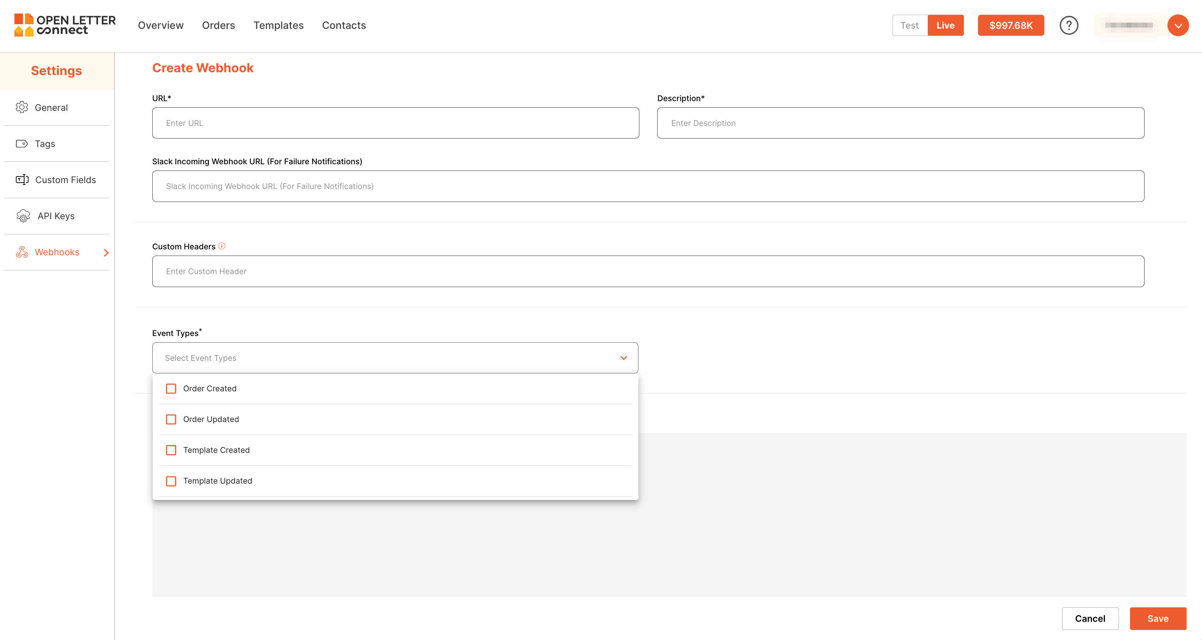 - On the Create Webhook page, fill in the required fields: