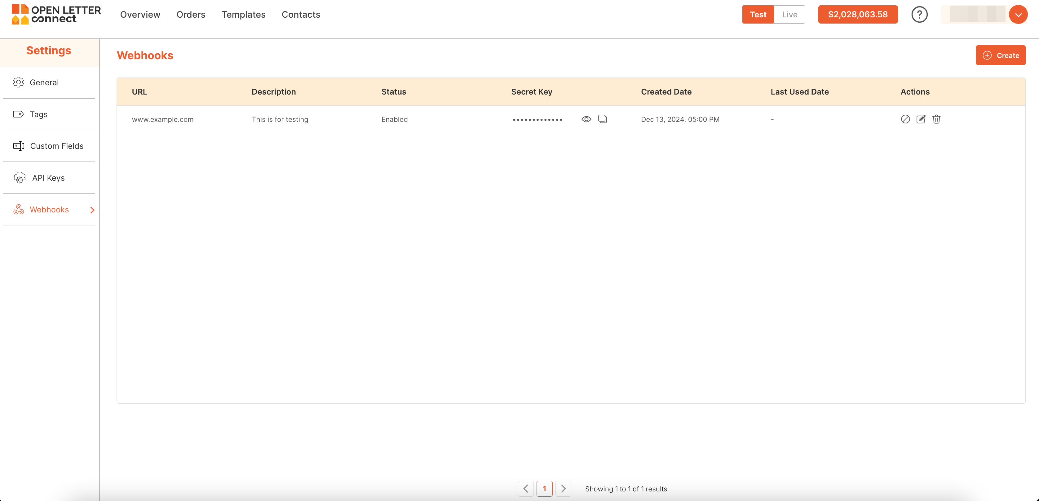- You can now view the list of created webhooks and manage them as needed.